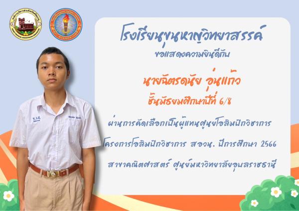 โรงเรียนขุนหาญวิทยาสรรค์ บริหารงานโดย นางวิไลลักษณ์ ศรีทากุล ผู้อำนวยการเชี่ยวชาญ ขอแสดงความยินดีกับ นายฉัตรดนัย อุ่นแก้ว นักเรียนชั้นมัธยมศึกษาปีที่ 6/8 เป็นผู้ผ่านคัดเลือกผู้แทนศูนย์โอลิมปิก ในโครงการโอลิมปิกวิชาการ สอวน. ปีการศึกษา 2566 สาขาคณิตศาสตร์ ศูนย์มหาวิทยาลัยอุบลราชธานี |