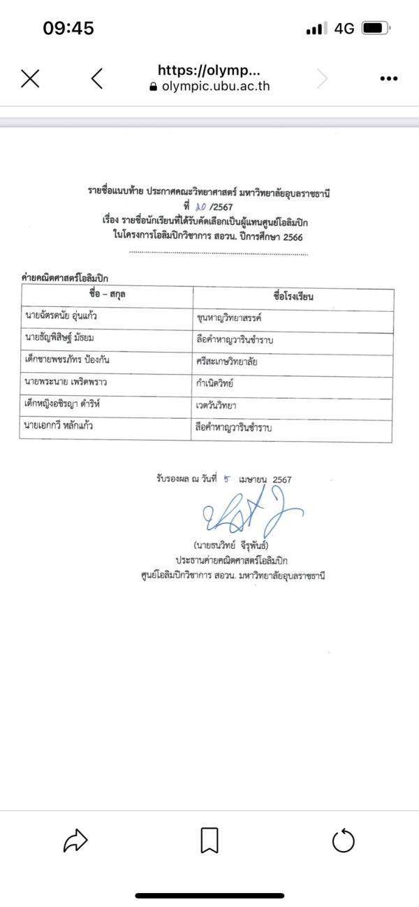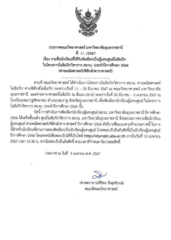 >> ผู้ผ่านคัดเลือกผู้แทนศูนย์โอลิมปิก ในโครงการโอลิมปิกวิชาการ สอวน. ปีการศึกษา 2566 สาขาคณิตศาสตร์ ศูนย์มหาวิทยาลัยอุบลราชธานี ( 7/เม.ย./2567 )